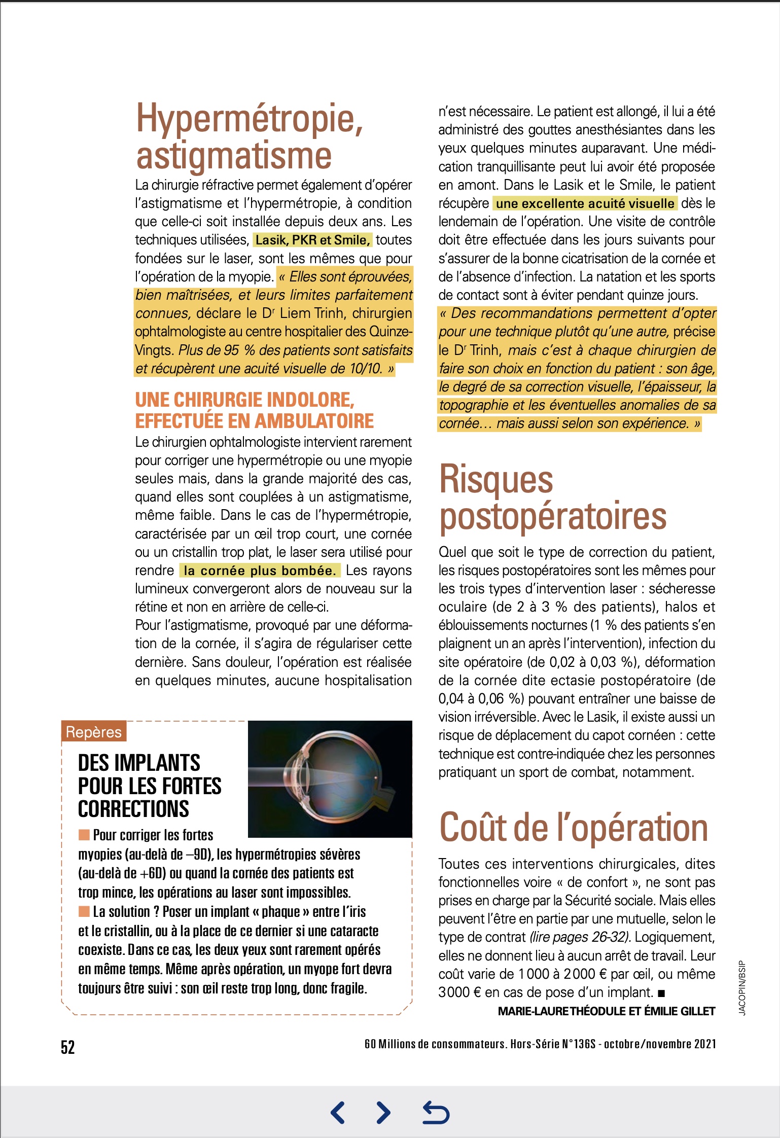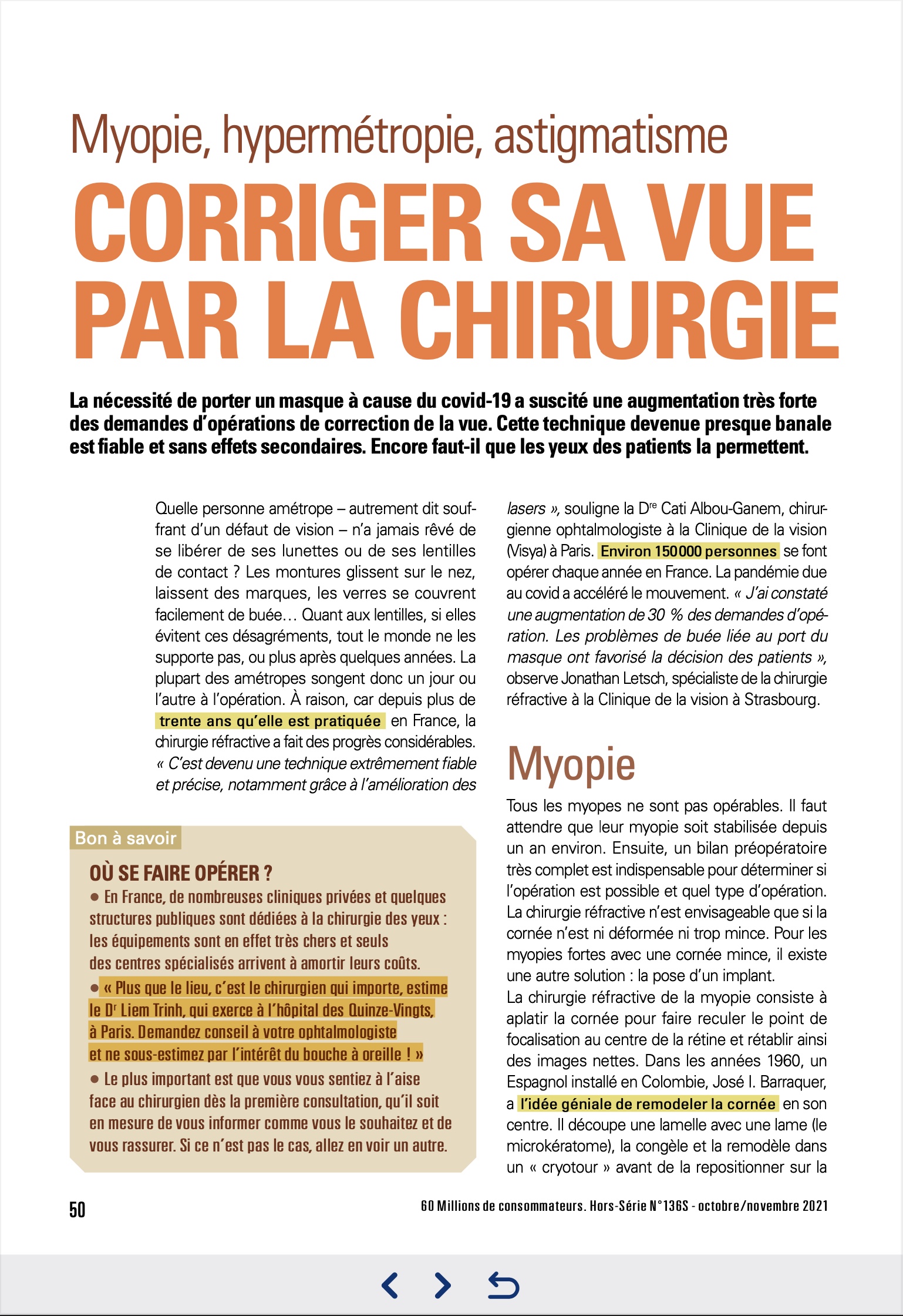 Dr Trinh par Dr. LIEM TRINH | 28 Octobre 2021Le Dr TRINH a été interviewé par le magazine "60 millions de consommateurs" dans son hors série d'octobre 2021 "Une vue au top" dans le chapitre "Myopie, hypermétropie, astigmatisme : corriger sa vue par la chirurgie".